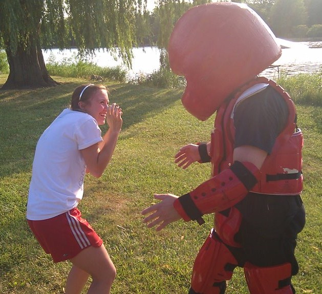 Women's Self Defense Student Instructor applying full force self defense techniques In public against a padded assailant ! ( padded for my safety not hers)